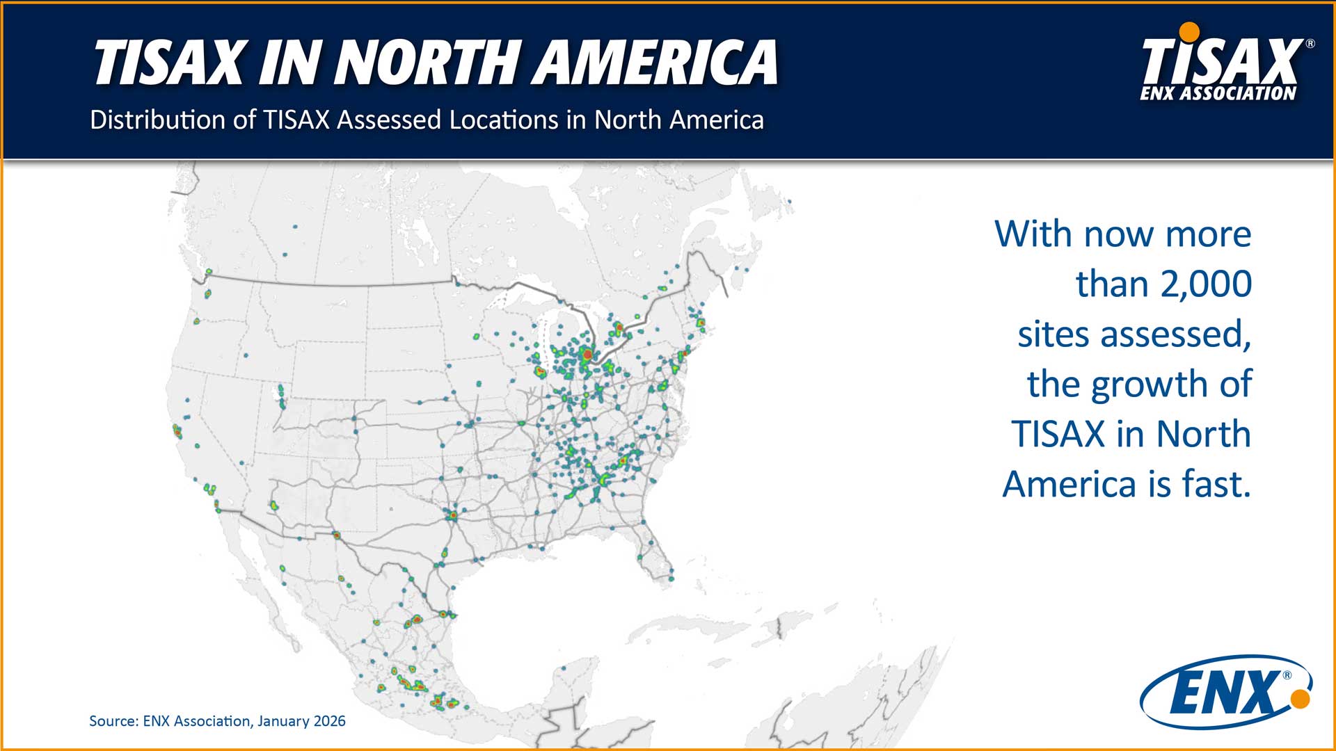 The North America heatmap shows that more than 2,000 sites have been assessed, underlining the rapid growth of TISAX in this region. Assessed locations are widely distributed across the United States, with visible concentrations in established industrial and technology regions, as well as additional clusters in Canada and Mexico.