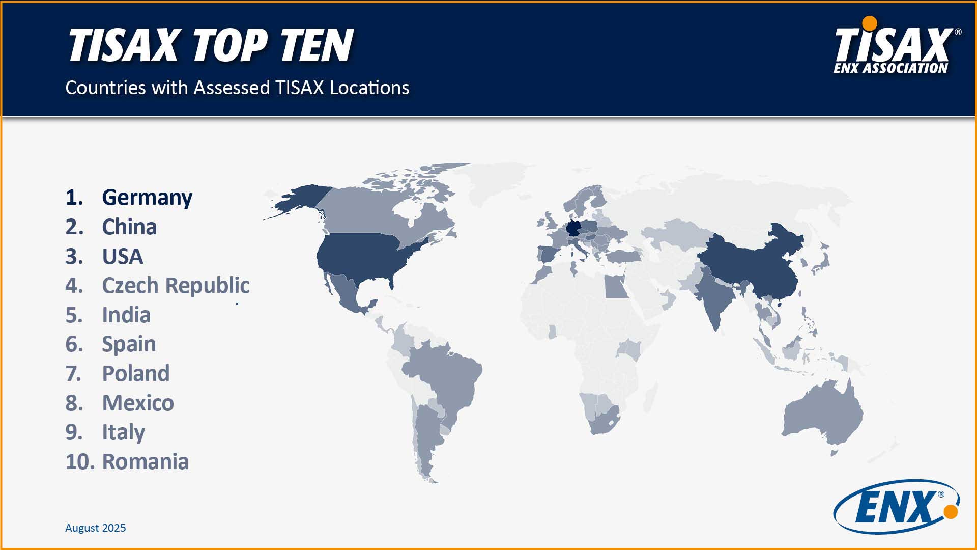 TISAX continues to demonstrate a strong and growing global footprint. Recent analyses published via our LinkedIn channel, including regional heatmaps and country rankings, illustrate how TISAX‑assessed locations are distributed across key automotive and industrial regions worldwide.