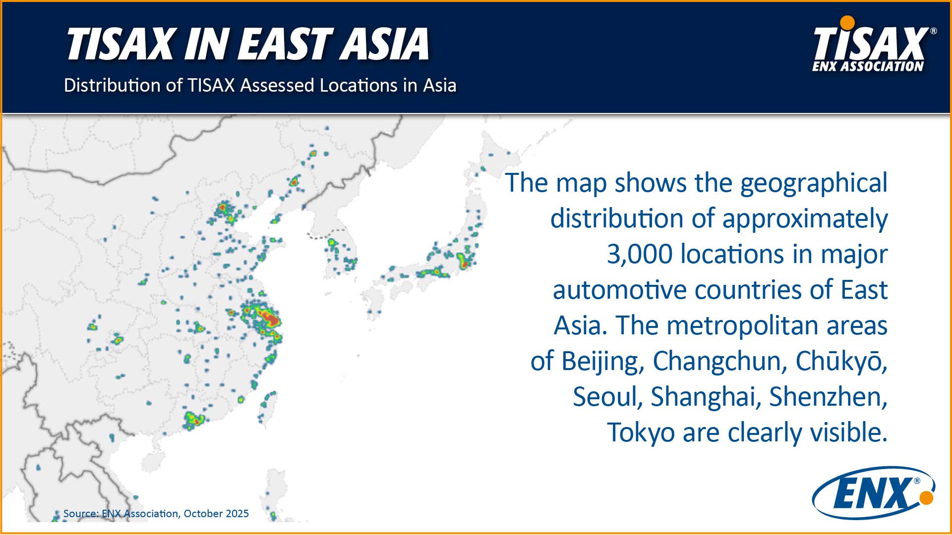 The East Asia heatmap shows a clear concentration of TISAX‑assessed locations along China’s eastern industrial corridors, complemented by notable clusters in Japan and South Korea. Beyond these high‑density areas, additional assessed locations are visible across the wider region.
